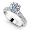 This striking engagement ring has a woven split shank lined with round diamonds set along the top half. The center diamond stone is haloed by a circle of more luxurious diamonds. With 59 to 63 diamonds depending on the size, this unique sparkler of a ring is sure to please!
